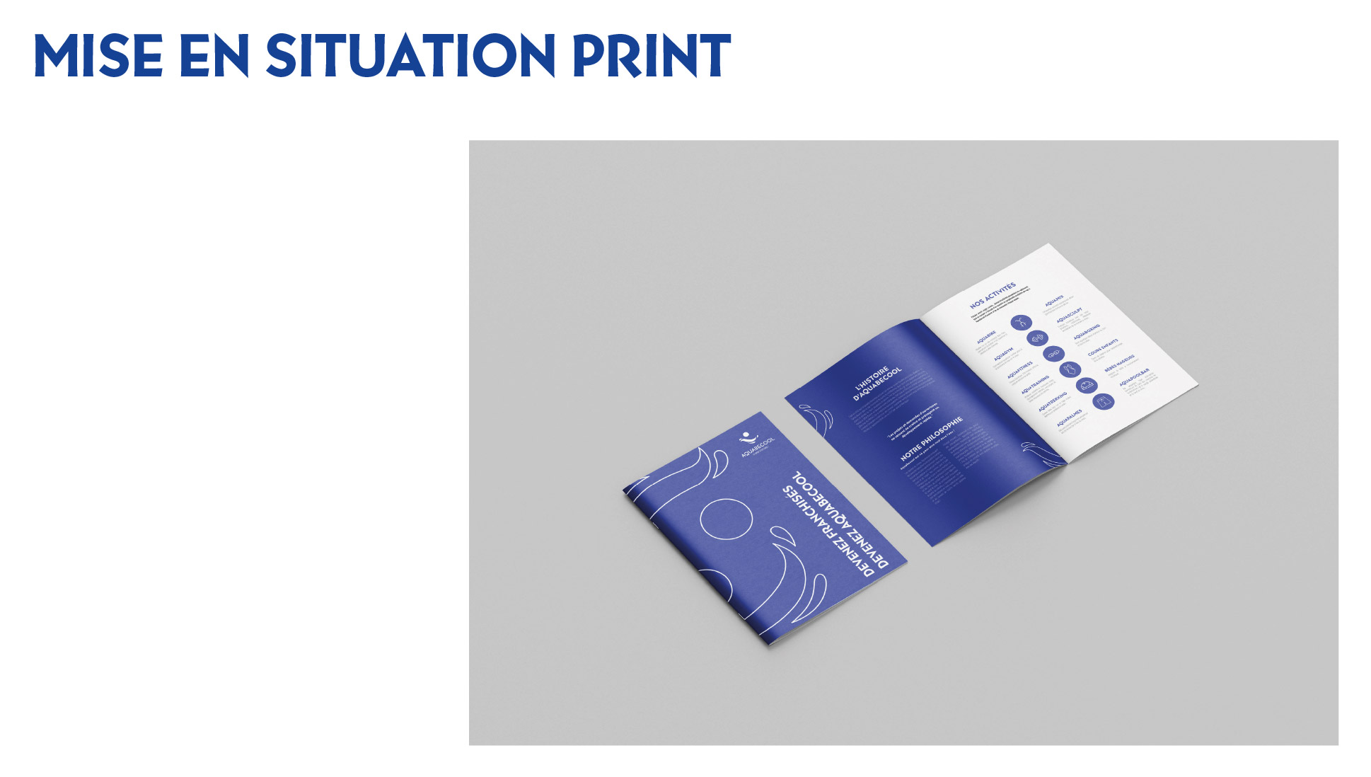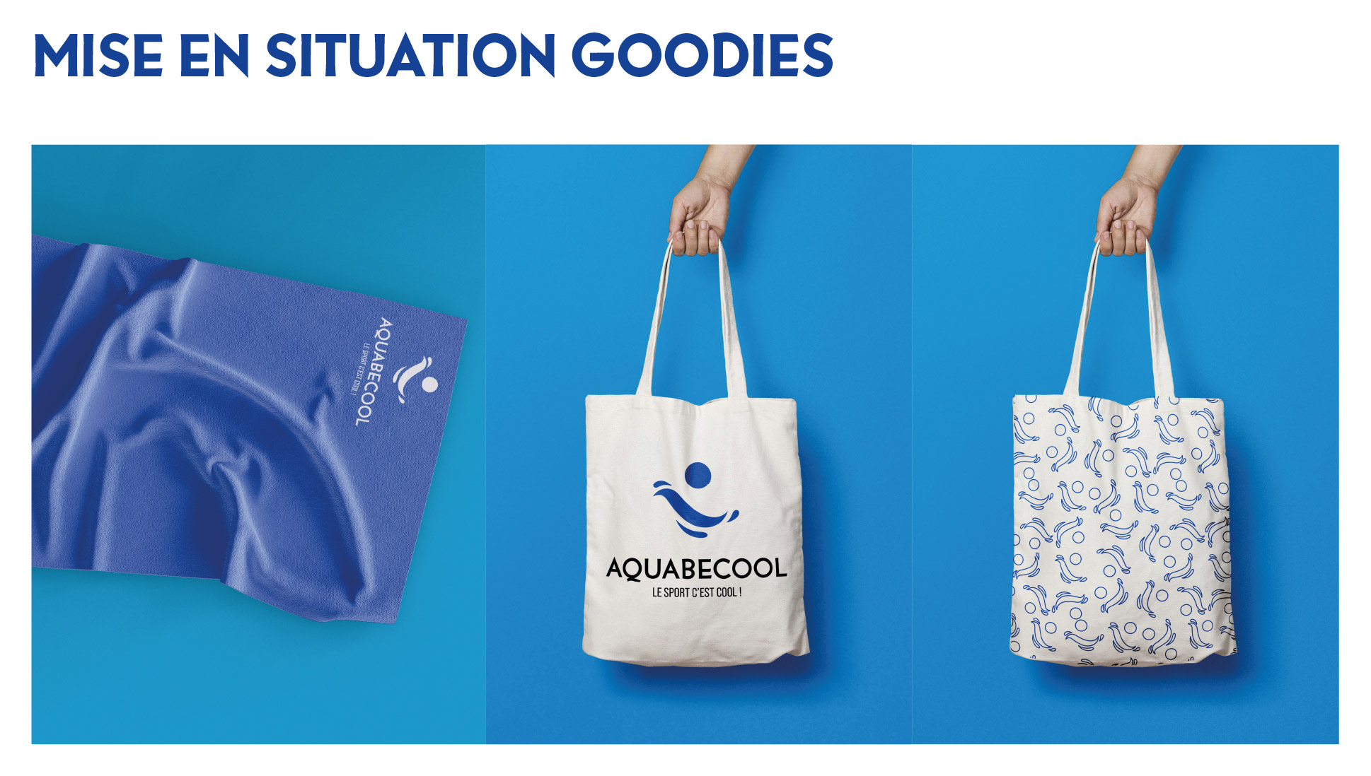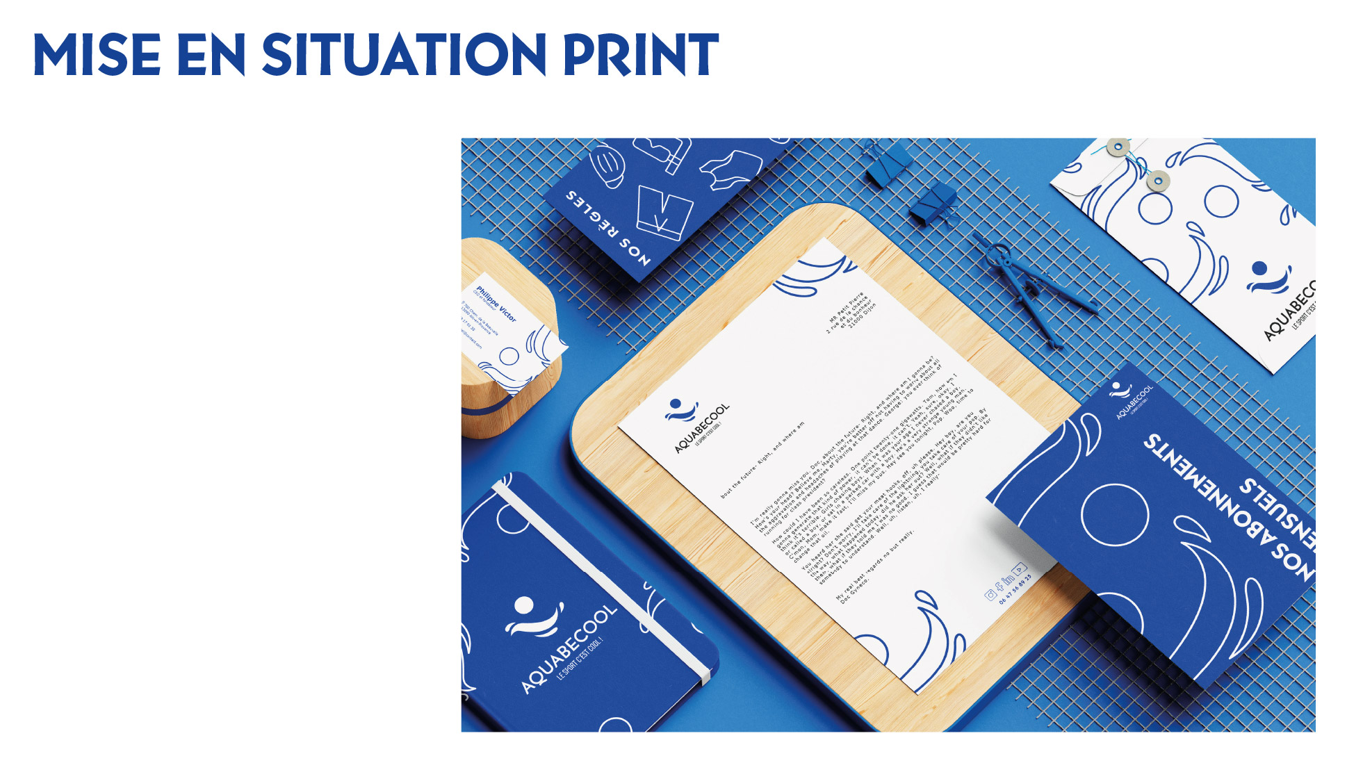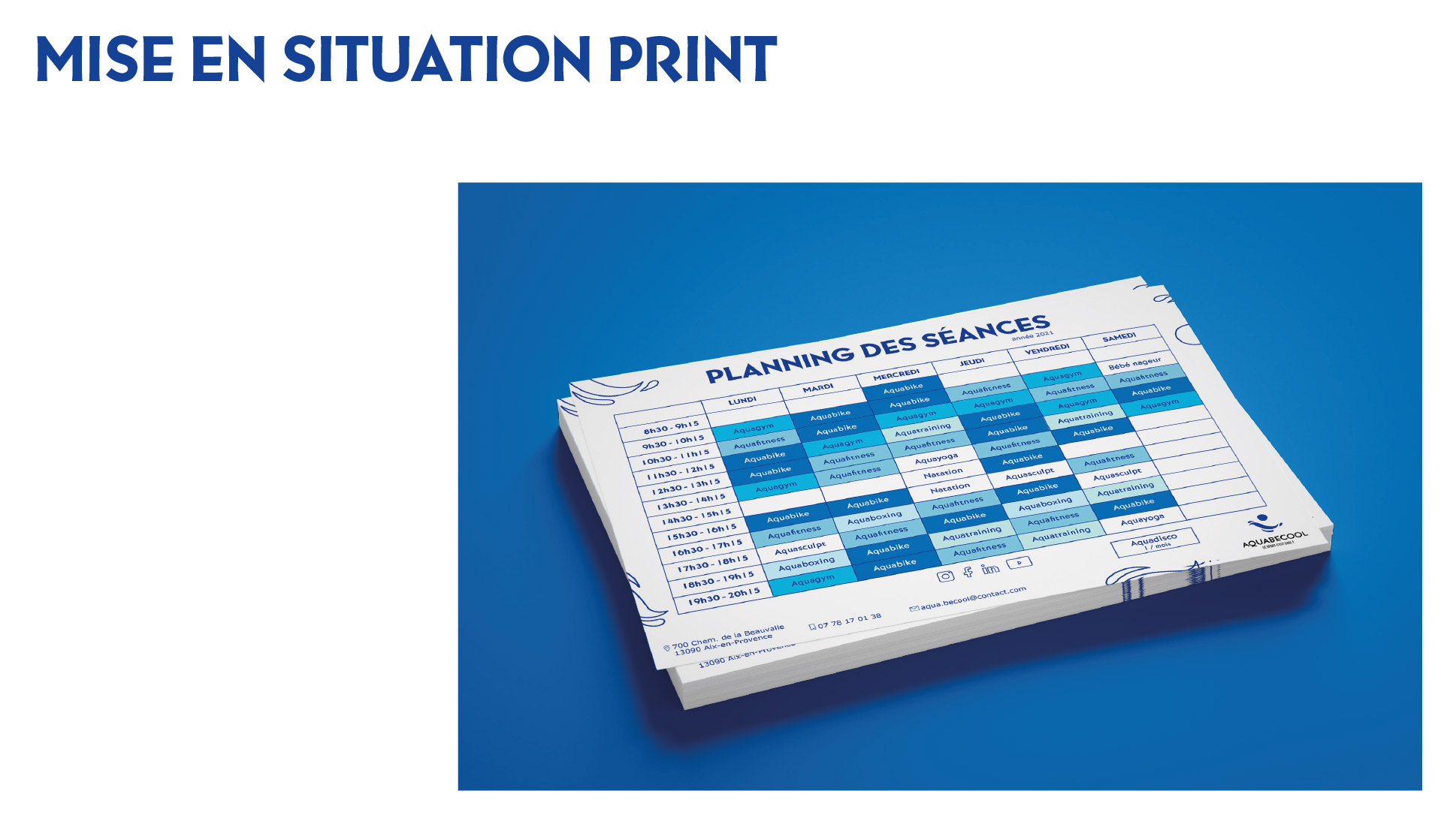 Projet commandité par Aquabecool. L’objectif étant de proposer une nouvelle jeunesse à l’image de ce centre de remise en forme et sports aquatique. Réalisation d’une nouvelle identité : logo, charte graphique, déclinaisons, couleurs, supports de communication et accessoires. Projet réalisé lors de mes études.