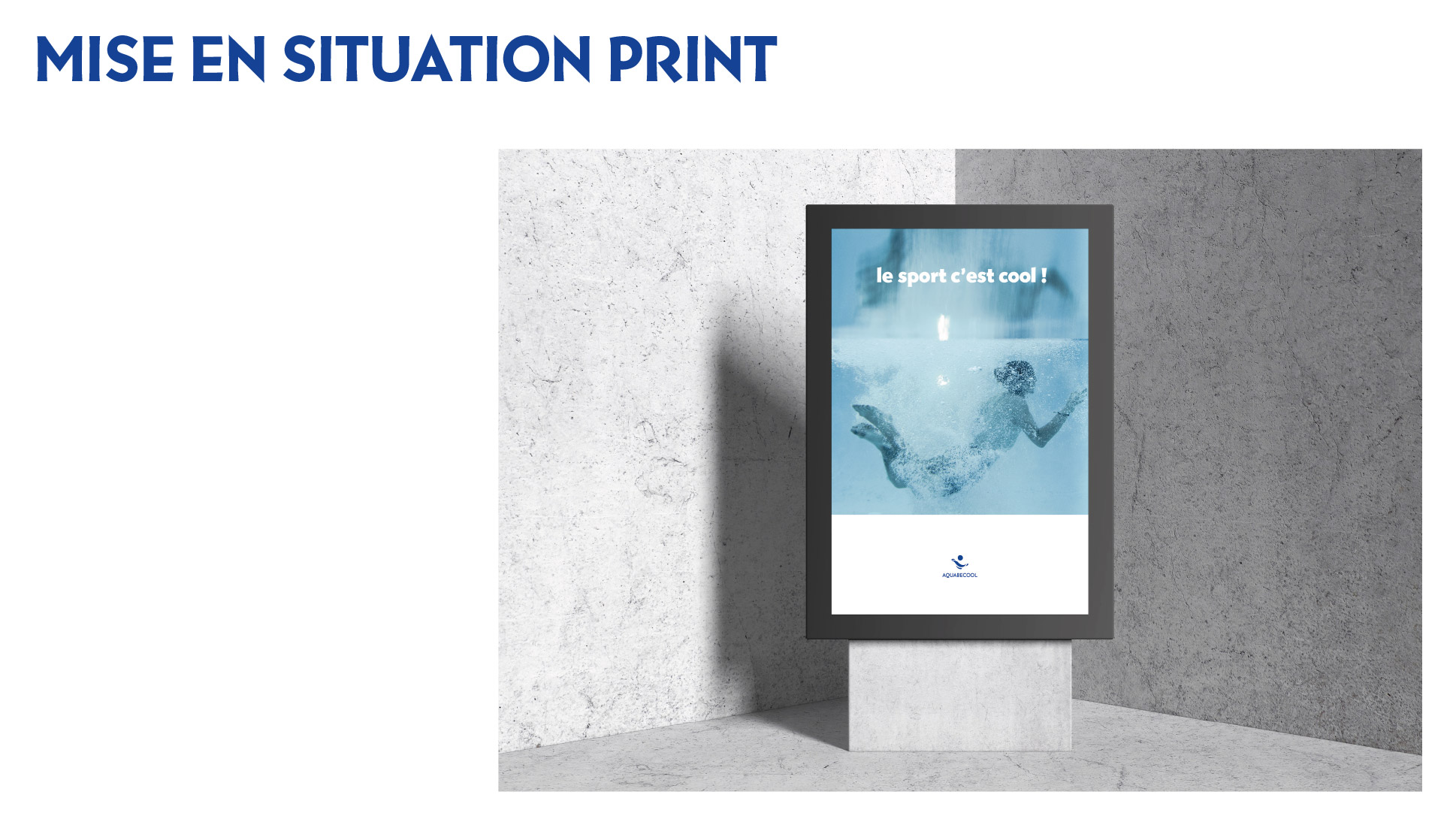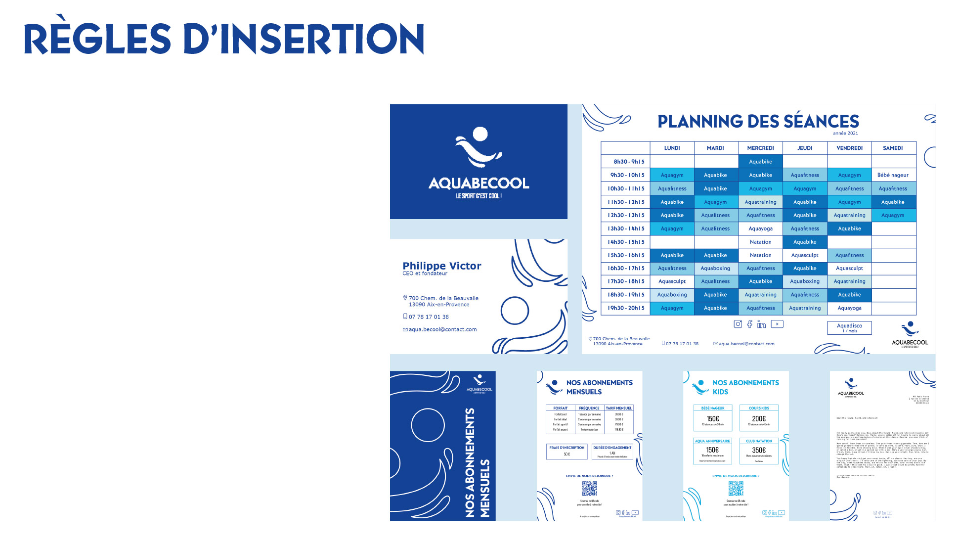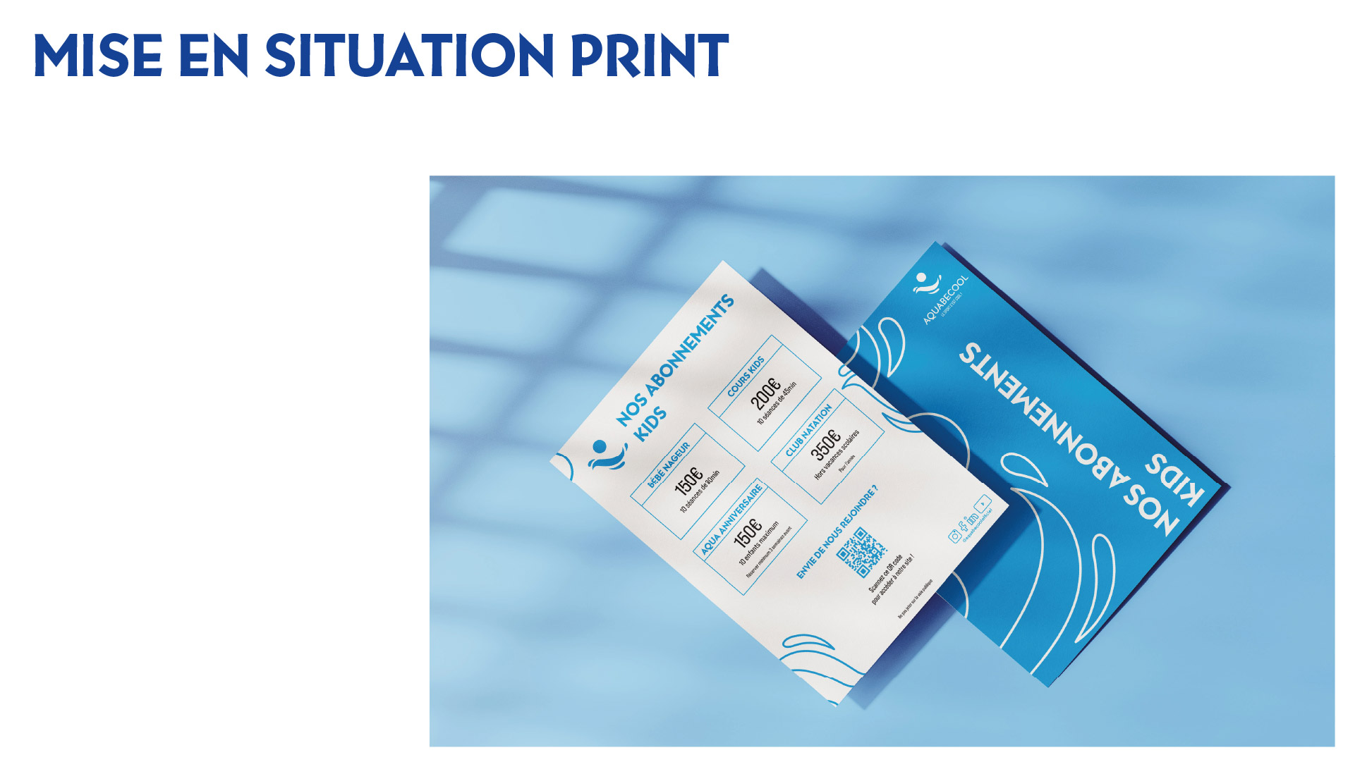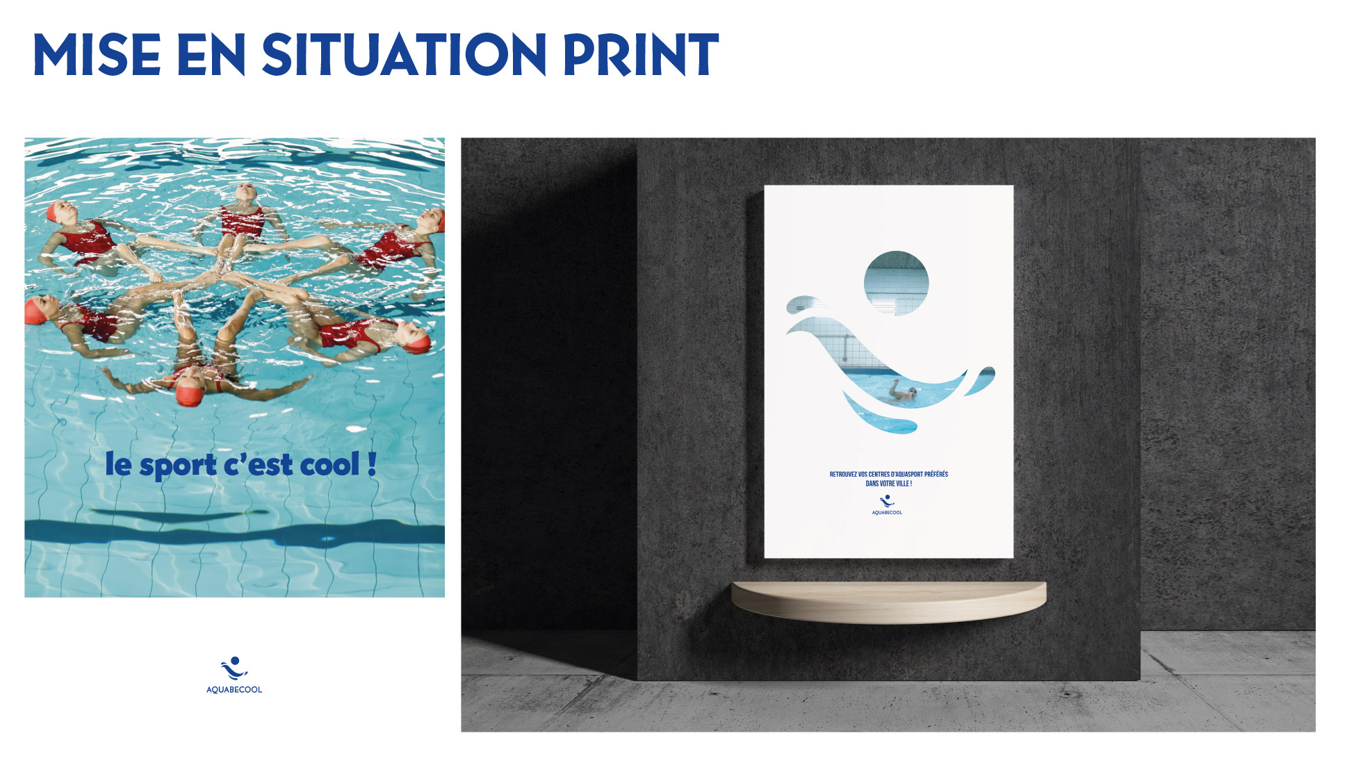 Projet commandité par Aquabecool. L’objectif étant de proposer une nouvelle jeunesse à l’image de ce centre de remise en forme et sports aquatique. Réalisation d’une nouvelle identité : logo, charte graphique, déclinaisons, couleurs, supports de communication et accessoires. Projet réalisé lors de mes études.