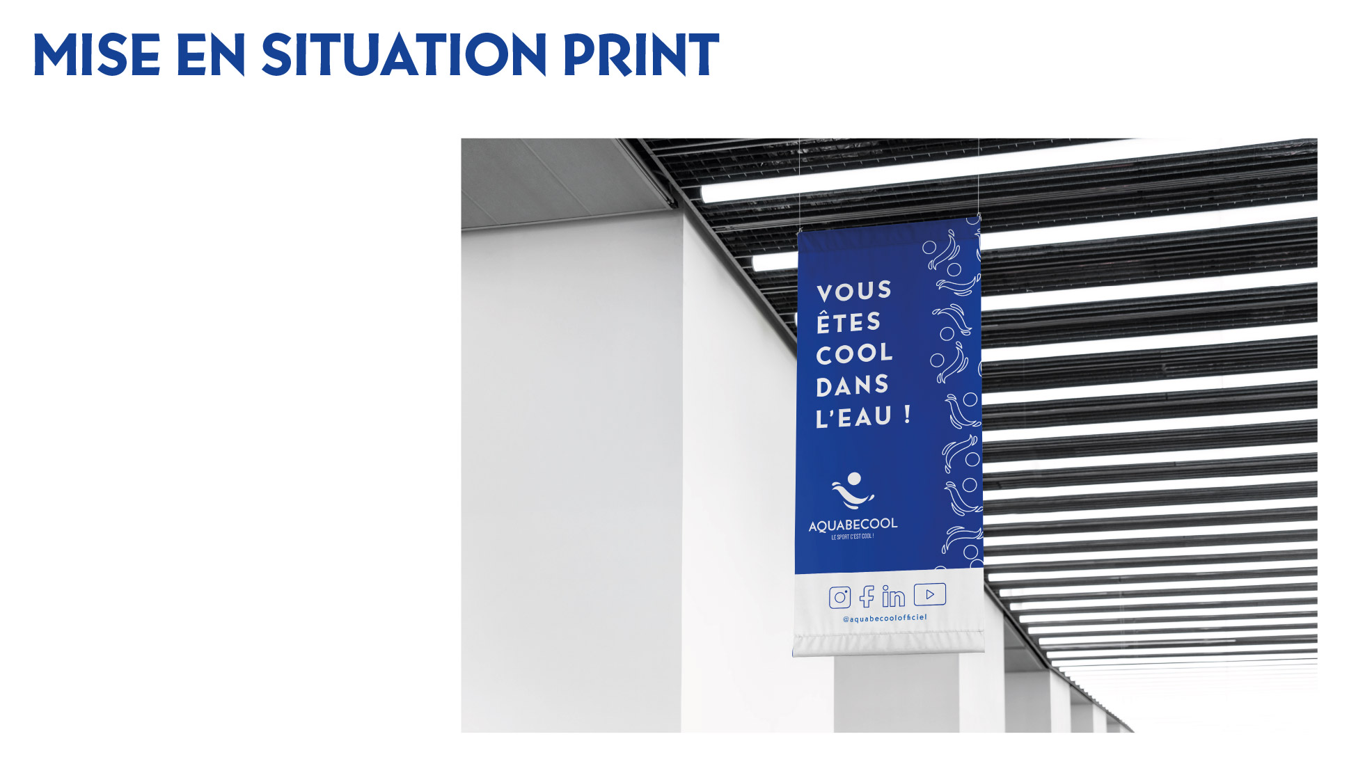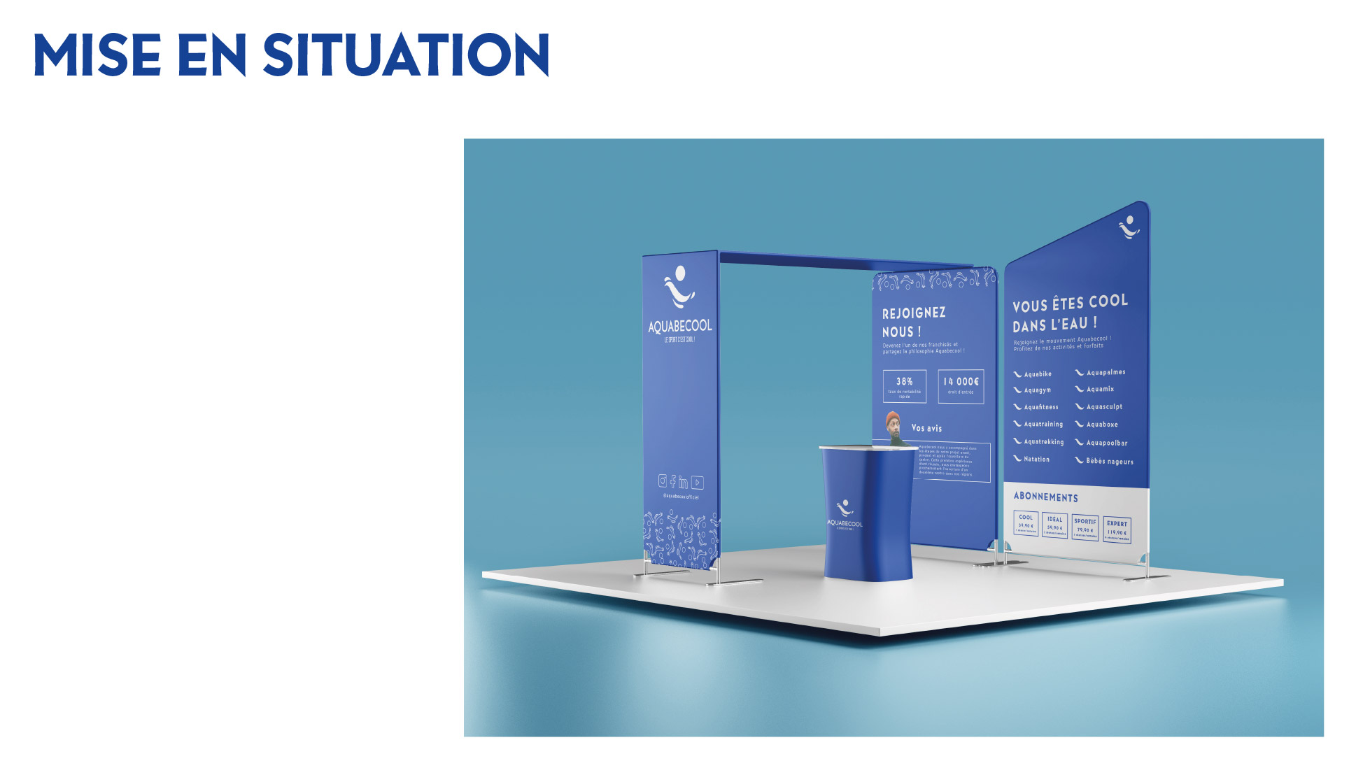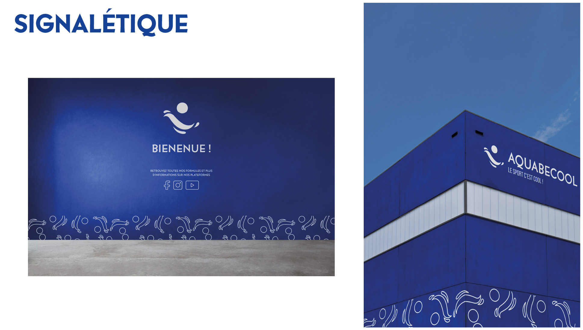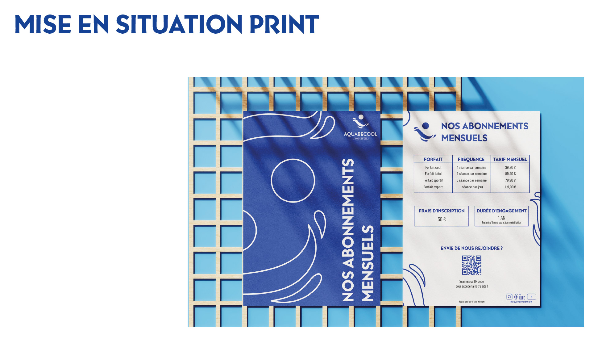 Projet commandité par Aquabecool. L’objectif étant de proposer une nouvelle jeunesse à l’image de ce centre de remise en forme et sports aquatique. Réalisation d’une nouvelle identité : logo, charte graphique, déclinaisons, couleurs, supports de communication et accessoires. Projet réalisé lors de mes études.